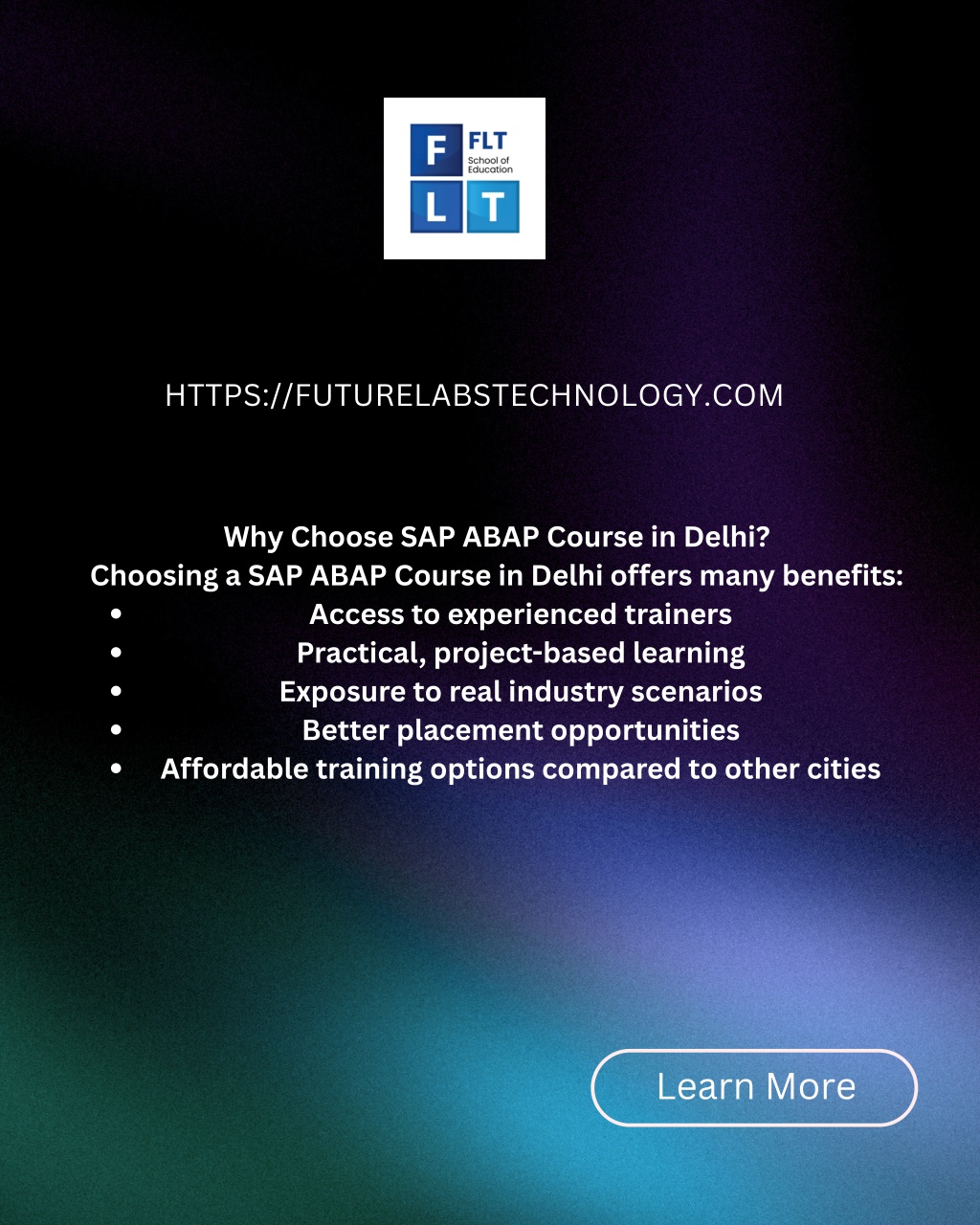 HTTPS://FUTURELABSTECHNOLOGY.COM Why Choose SAP ABAP Course in Delhi? Choosing a SAP ABAP Course in Delhi offers many benefits: Access to experienced trainers Practical, project-based learning Exposure to real industry scenarios Better placement opportunities Affordable training options compared to other cities Learn More