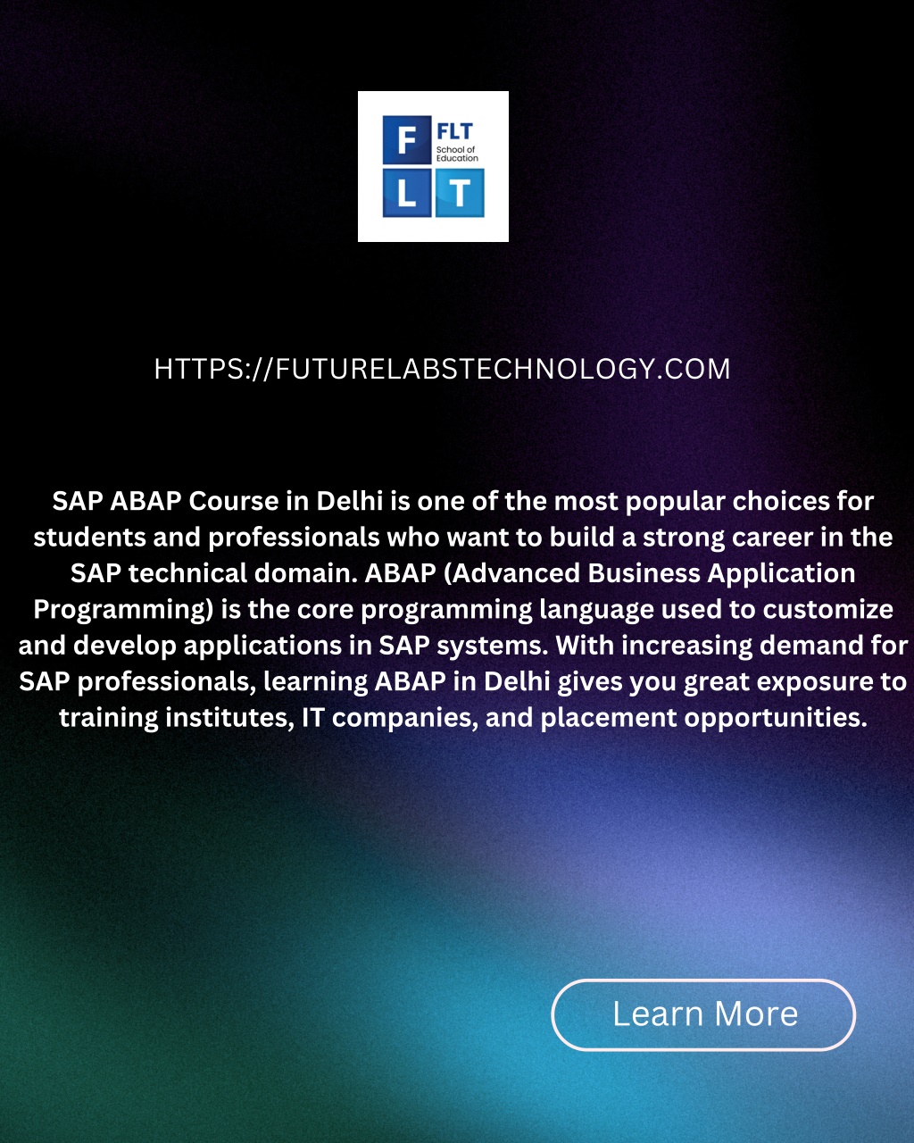 HTTPS://FUTURELABSTECHNOLOGY.COM SAP ABAP Course in Delhi is one of the most popular choices for students and professionals who want to build a strong career in the SAP technical domain. ABAP (Advanced Business Application Programming) is the core programming language used to customize and develop applications in SAP systems. With increasing demand for SAP professionals, learning ABAP in Delhi gives you great exposure to training institutes, IT companies, and placement opportunities. Learn More