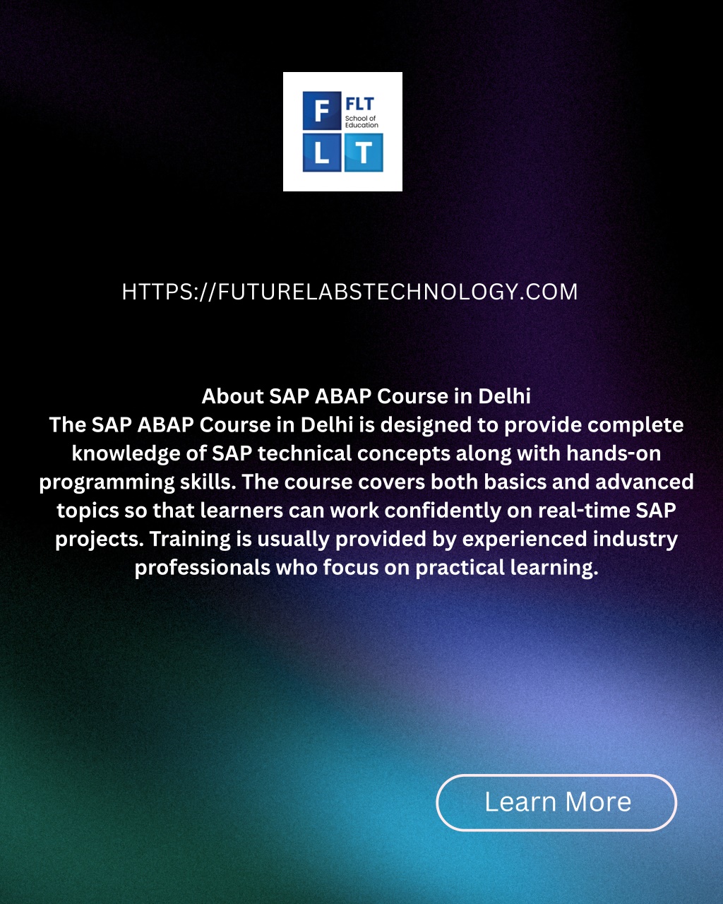 HTTPS://FUTURELABSTECHNOLOGY.COM The SAP ABAP Course in Delhi is designed to provide complete knowledge of SAP technical concepts along with hands-on programming skills. The course covers both basics and advanced topics so that learners can work confidently on real-time SAP projects. Training is usually provided by experienced industry professionals who focus on practical learning. Delhi has become a major hub for SAP training because of its strong IT ecosystem, corporate presence, and availability of quality training centers. Learn More