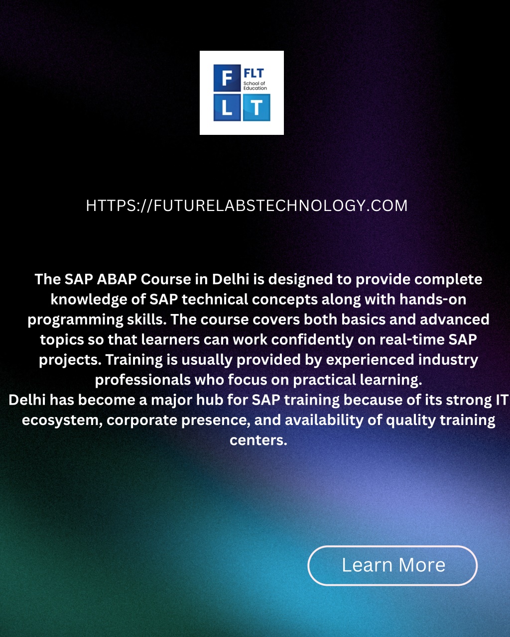 HTTPS://FUTURELABSTECHNOLOGY.COM SAP ABAP Course in Delhi is one of the most popular choices for students and professionals who want to build a strong career in the SAP technical domain. ABAP (Advanced Business Application Programming) is the core programming language used to customize and develop applications in SAP systems. With increasing demand for SAP professionals, learning ABAP in Delhi gives you great exposure to training institutes, IT companies, and placement opportunities. Learn More