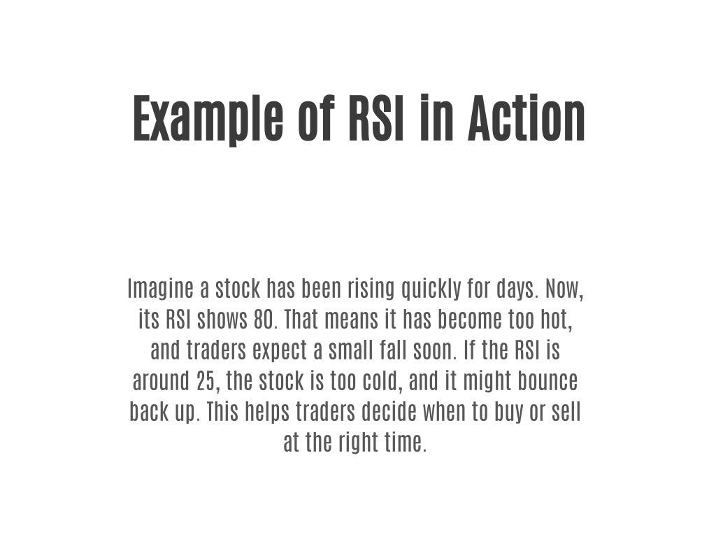 Example of RSI in Action Imagine a stock has been rising quickly for days. Now, its RSI shows 80. That means it has become too hot, and traders expect a small fall soon. If the RSI is around 25, the stock is too cold, and it might bounce back up. This helps traders decide when to buy or sell at the right time.