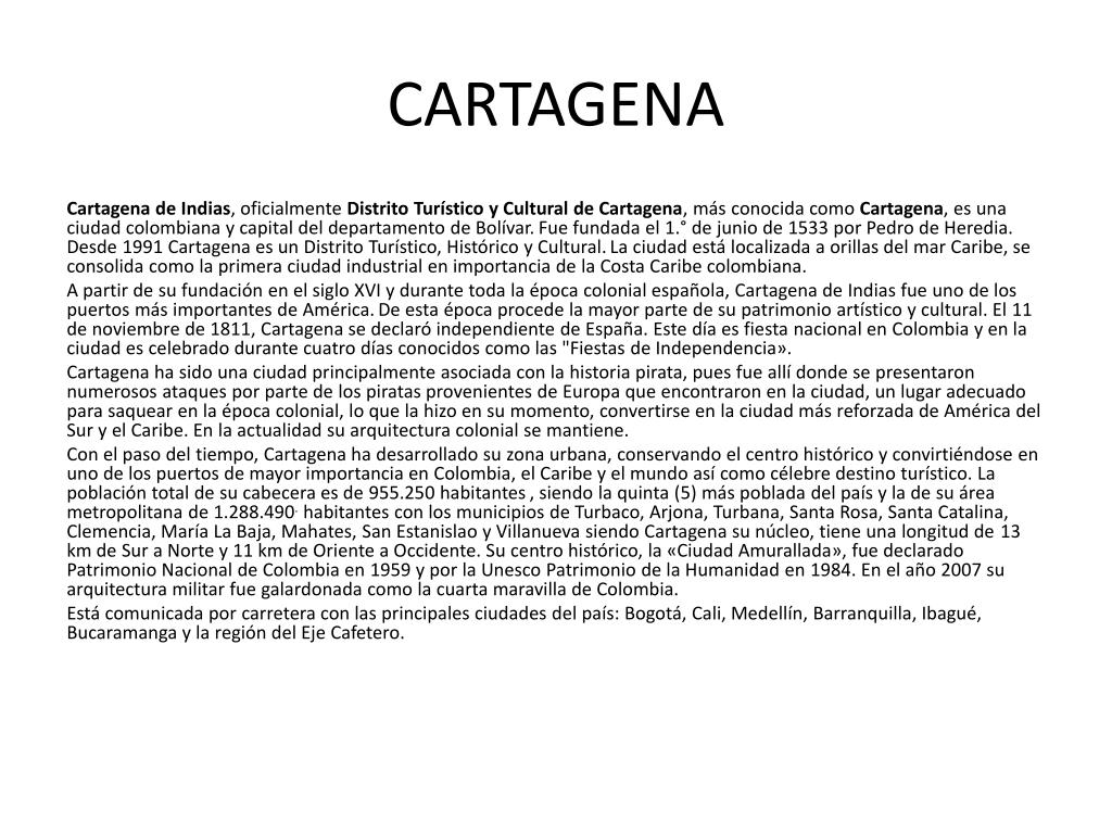 CARTAGENA Cartagena de Indias, oficialmente Distrito Turístico y Cultural de Cartagena, más conocida como Cartagena, es una ciudad colombiana y capital del departamento de Bolívar.Fue fundada el 1.° de junio de 1533 por Pedro de Heredia.Desde 1991 Cartagena es un Distrito Turístico, Histórico y Cultural.La ciudad está localizada a orillas del mar Caribe, se consolida como la primera ciudad industrial en importancia de la Costa Caribe colombiana. A partir de su fundación en el siglo XVI y durante toda la época colonial española, Cartagena de Indias fue uno de los puertos más importantes de América.De esta época procede la mayor parte de su patrimonio artístico y cultural. El 11 de noviembre de 1811, Cartagena se declaró independiente de España. Este día es fiesta nacional en Colombia y en la ciudad es celebrado durante cuatro días conocidos como las "Fiestas de Independencia». Cartagena ha sido una ciudad principalmente asociada con la historia pirata, pues fue allí donde se presentaron numerosos ataques por parte de los piratas provenientes de Europa que encontraron en la ciudad, un lugar adecuado para saquear en la época colonial, lo que la hizo en su momento, convertirse en la ciudad más reforzada de América del Sur y el Caribe. En la actualidad su arquitectura colonial se mantiene. Con el paso del tiempo, Cartagena ha desarrollado su zona urbana, conservando el centro histórico y convirtiéndose en uno de los puertos de mayor importancia en Colombia, el Caribe y el mundo así como célebre destino turístico. La población total de su cabecera es de 955.250 habitantes, siendo la quinta (5) más poblada del país y la de su área metropolitana de 1.288.490. habitantes con los municipios de Turbaco, Arjona, Turbana, Santa Rosa, Santa Catalina, Clemencia, María La Baja, Mahates, San Estanislao y Villanueva siendo Cartagena su núcleo, tiene una longitud de 13 km de Sur a Norte y 11 km de Oriente a Occidente. Su centro histórico, la «Ciudad Amurallada», fue declarado Patrimonio Nacional de Colombia en 1959 y por la Unesco Patrimonio de la Humanidad en 1984. En el año 2007 su arquitectura militar fue galardonada como la cuarta maravilla de Colombia. Está comunicada por carretera con las principales ciudades del país: Bogotá, Cali, Medellín, Barranquilla, Ibagué, Bucaramanga y la región del Eje Cafetero.