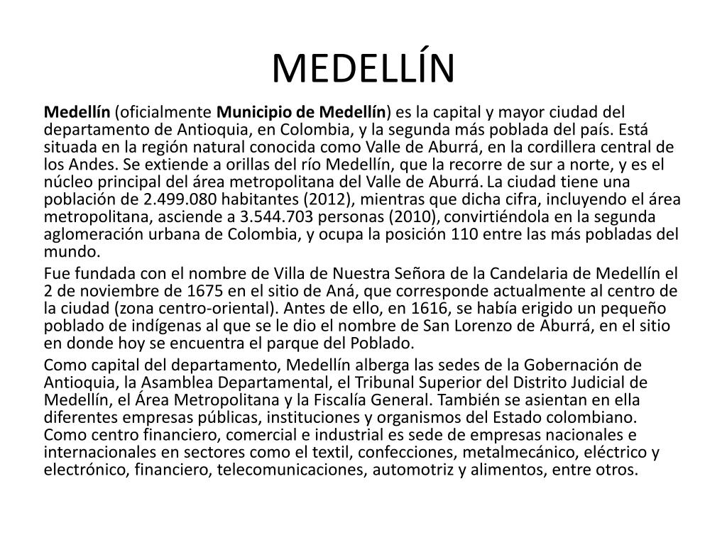 MEDELLÍN Medellín (oficialmente Municipio de Medellín) es la capital y mayor ciudad del departamento de Antioquia, en Colombia, y la segunda más poblada del país. Está situada en la región natural conocida como Valle de Aburrá, en la cordillera central de los Andes. Se extiende a orillas del río Medellín, que la recorre de sur a norte, y es el núcleo principal del área metropolitana del Valle de Aburrá.La ciudad tiene una población de 2.499.080 habitantes (2012), mientras que dicha cifra, incluyendo el área metropolitana, asciende a 3.544.703 personas (2010),convirtiéndola en la segunda aglomeración urbana de Colombia, y ocupa la posición 110 entre las más pobladas del mundo. Fue fundada con el nombre de Villa de Nuestra Señora de la Candelaria de Medellín el 2 de noviembre de 1675 en el sitio de Aná, que corresponde actualmente al centro de la ciudad (zona centro-oriental). Antes de ello, en 1616, se había erigido un pequeño poblado de indígenas al que se le dio el nombre de San Lorenzo de Aburrá, en el sitio en donde hoy se encuentra el parque del Poblado. Como capital del departamento, Medellín alberga las sedes de la Gobernación de Antioquia, la Asamblea Departamental, el Tribunal Superior del Distrito Judicial de Medellín, el Área Metropolitana y la Fiscalía General. También se asientan en ella diferentes empresas públicas, instituciones y organismos del Estado colombiano. Como centro financiero, comercial e industrial es sede de empresas nacionales e internacionales en sectores como el textil, confecciones, metalmecánico, eléctrico y electrónico, financiero, telecomunicaciones, automotriz y alimentos, entre otros.