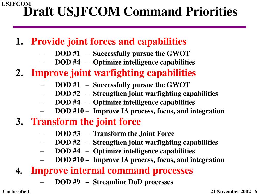 Draft USJFCOM Command Priorities • Provide joint forces and capabilities • DOD #1 – Successfully pursue the GWOT • DOD #4 – Optimize intelligence capabilities • Improve joint warfighting capabilities • DOD #1 – Successfully pursue the GWOT • DOD #2 – Strengthen joint warfighting capabilities • DOD #4 – Optimize intelligence capabilities • DOD #10 – Improve IA process, focus, and integration • Transform the joint force • DOD #3 – Transform the Joint Force • DOD #2 – Strengthen joint warfighting capabilities • DOD #4 – Optimize intelligence capabilities • DOD #10 – Improve IA process, focus, and integration • Improve internal command processes • DOD #9 – Streamline DoD processes