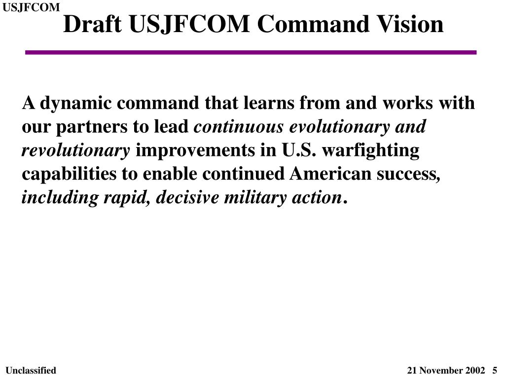 Draft USJFCOM Command Vision A dynamic command that learns from and works with our partners to lead continuousevolutionary and revolutionary improvements in U.S. warfighting capabilities to enable continued American success, including rapid, decisive military action.