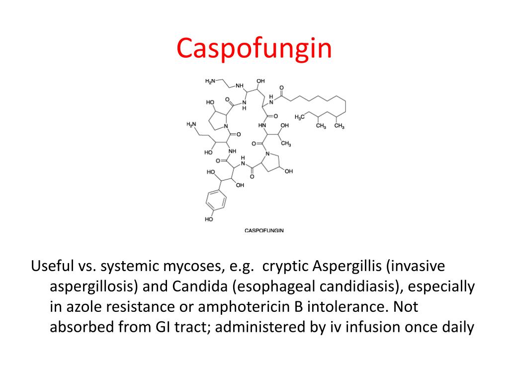 Caspofungin Useful vs. systemic mycoses, e.g. cryptic Aspergillis (invasive aspergillosis) and Candida (esophageal candidiasis), especially in azole resistance or amphotericin B intolerance. Not absorbed from GI tract; administered by iv infusion once daily
