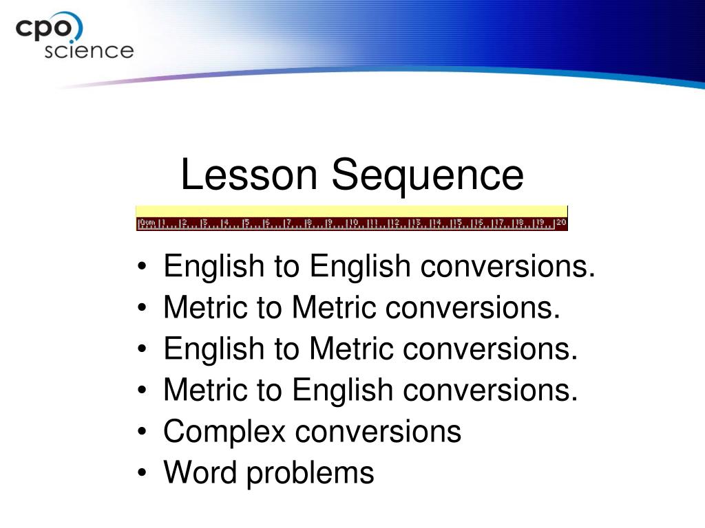 Lesson Sequence • English to English conversions. • Metric to Metric conversions. • English to Metric conversions. • Metric to English conversions. • Complex conversions • Word problems