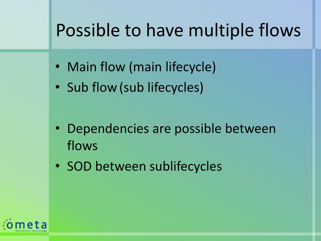 Possibleto have multiple flows • Main flow (mainlifecycle) • Sub flow (sub lifecycles) • Dependencies are possiblebetweenflows • SOD betweensublifecycles