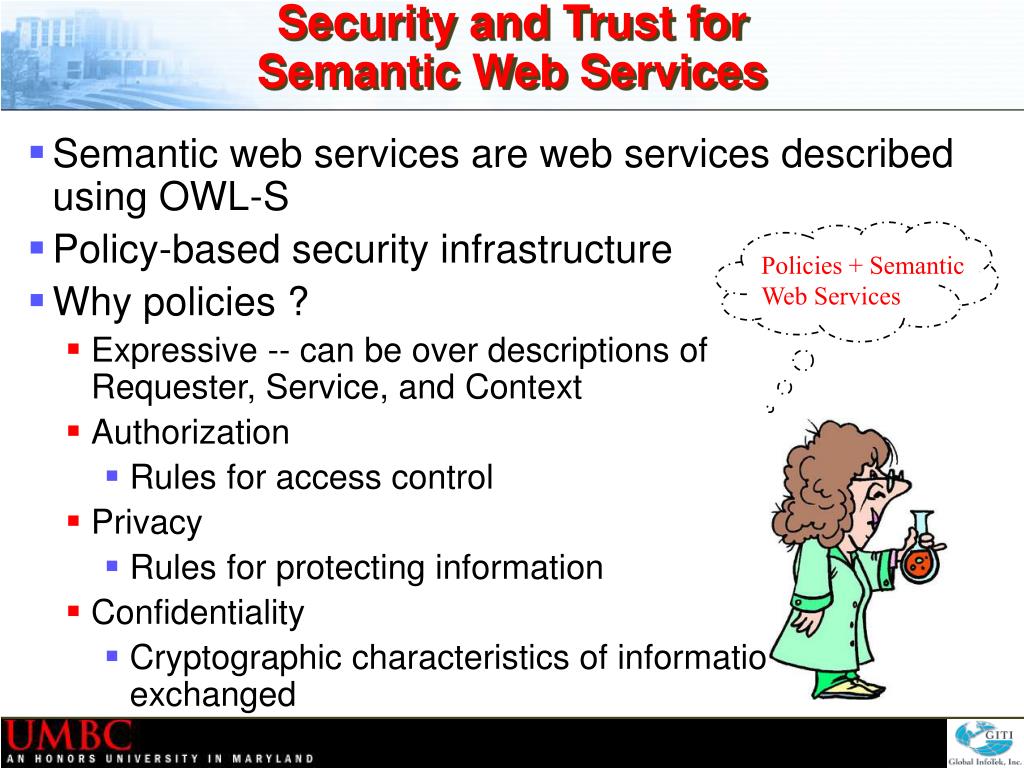 Security and Trust forSemantic Web Services • Semantic web services are web services described using OWL-S • Policy-based security infrastructure • Why policies ? • Expressive -- can be over descriptions ofRequester, Service, and Context • Authorization • Rules for access control • Privacy • Rules for protecting information • Confidentiality • Cryptographic characteristics of information exchanged Policies + Semantic Web Services