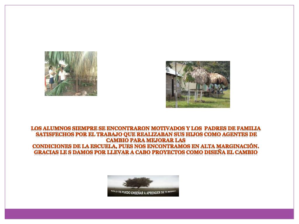 LOS ALUMNOS SIEMPRE SE ENCONTRARON MOTIVADOS Y LOS PADRES DE FAMILIA SATISFECHOS POR EL TRABAJO QUE REALIZABAN SUS HIJOS COMO AGENTES DE CAMBIO PARA MEJORAR LAS CONDICIONES DE LA ESCUELA, PUES NOS ENCONTRAMOS EN ALTA MARGINACIÓN. GRACIAS LE S DAMOS POR LLEVAR A CABO PROYECTOS COMO DISEÑA EL CAMBIO