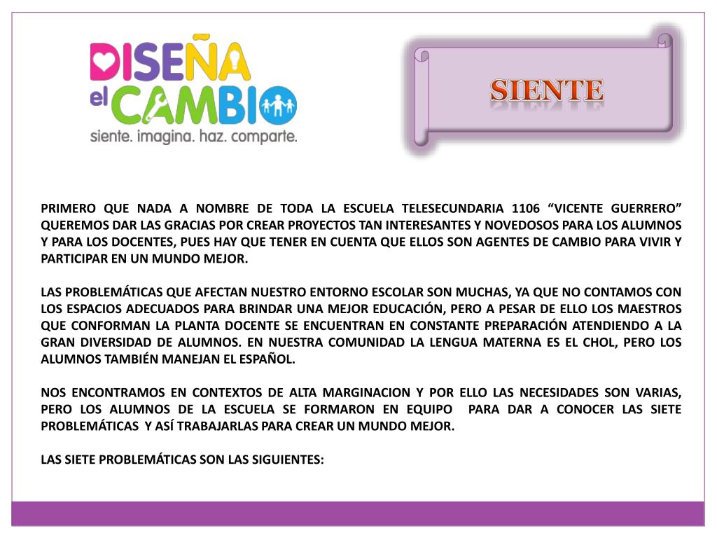 siente PRIMERO QUE NADA A NOMBRE DE TODA LA ESCUELA TELESECUNDARIA 1106 “VICENTE GUERRERO” QUEREMOS DAR LAS GRACIAS POR CREAR PROYECTOS TAN INTERESANTES Y NOVEDOSOS PARA LOS ALUMNOS Y PARA LOS DOCENTES, PUES HAY QUE TENER EN CUENTA QUE ELLOS SON AGENTES DE CAMBIO PARA VIVIR Y PARTICIPAR EN UN MUNDO MEJOR. LAS PROBLEMÁTICAS QUE AFECTAN NUESTRO ENTORNO ESCOLAR SON MUCHAS, YA QUE NO CONTAMOS CON LOS ESPACIOS ADECUADOS PARA BRINDAR UNA MEJOR EDUCACIÓN, PERO A PESAR DE ELLO LOS MAESTROS QUE CONFORMAN LA PLANTA DOCENTE SE ENCUENTRAN EN CONSTANTE PREPARACIÓN ATENDIENDO A LA GRAN DIVERSIDAD DE ALUMNOS. EN NUESTRA COMUNIDAD LA LENGUA MATERNA ES EL CHOL, PERO LOS ALUMNOS TAMBIÉN MANEJAN EL ESPAÑOL. NOS ENCONTRAMOS EN CONTEXTOS DE ALTA MARGINACION Y POR ELLO LAS NECESIDADES SON VARIAS, PERO LOS ALUMNOS DE LA ESCUELA SE FORMARON EN EQUIPO PARA DAR A CONOCER LAS SIETE PROBLEMÁTICAS Y ASÍ TRABAJARLAS PARA CREAR UN MUNDO MEJOR. LAS SIETE PROBLEMÁTICAS SON LAS SIGUIENTES: