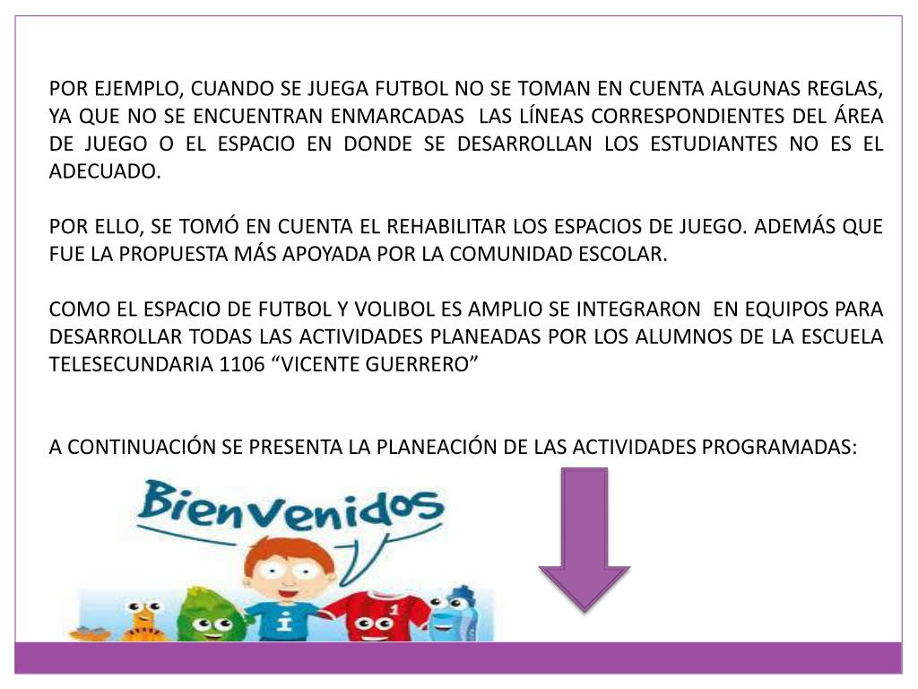 POR EJEMPLO, CUANDO SE JUEGA FUTBOL NO SE TOMAN EN CUENTA ALGUNAS REGLAS, YA QUE NO SE ENCUENTRAN ENMARCADAS LAS LÍNEAS CORRESPONDIENTES DEL ÁREA DE JUEGO O EL ESPACIO EN DONDE SE DESARROLLAN LOS ESTUDIANTES NO ES EL ADECUADO. POR ELLO, SE TOMÓ EN CUENTA EL REHABILITAR LOS ESPACIOS DE JUEGO. ADEMÁS QUE FUE LA PROPUESTA MÁS APOYADA POR LA COMUNIDAD ESCOLAR. COMO EL ESPACIO DE FUTBOL Y VOLIBOL ES AMPLIO SE INTEGRARON EN EQUIPOS PARA DESARROLLAR TODAS LAS ACTIVIDADES PLANEADAS POR LOS ALUMNOS DE LA ESCUELA TELESECUNDARIA 1106 “VICENTE GUERRERO” A CONTINUACIÓN SE PRESENTA LA PLANEACIÓN DE LAS ACTIVIDADES PROGRAMADAS: