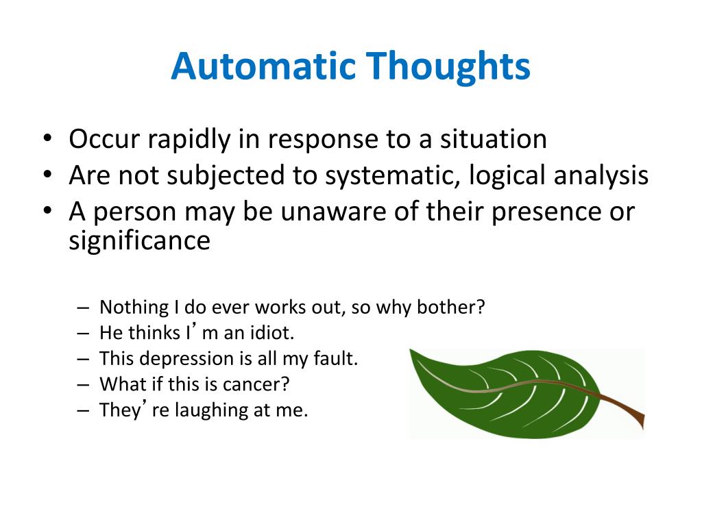 Automatic Thoughts • Occur rapidly in response to a situation • Are not subjected to systematic, logical analysis • A person may be unaware of their presence or significance • Nothing I do ever works out, so why bother? • He thinks I’m an idiot. • This depression is all my fault. • What if this is cancer? • They’re laughing at me.