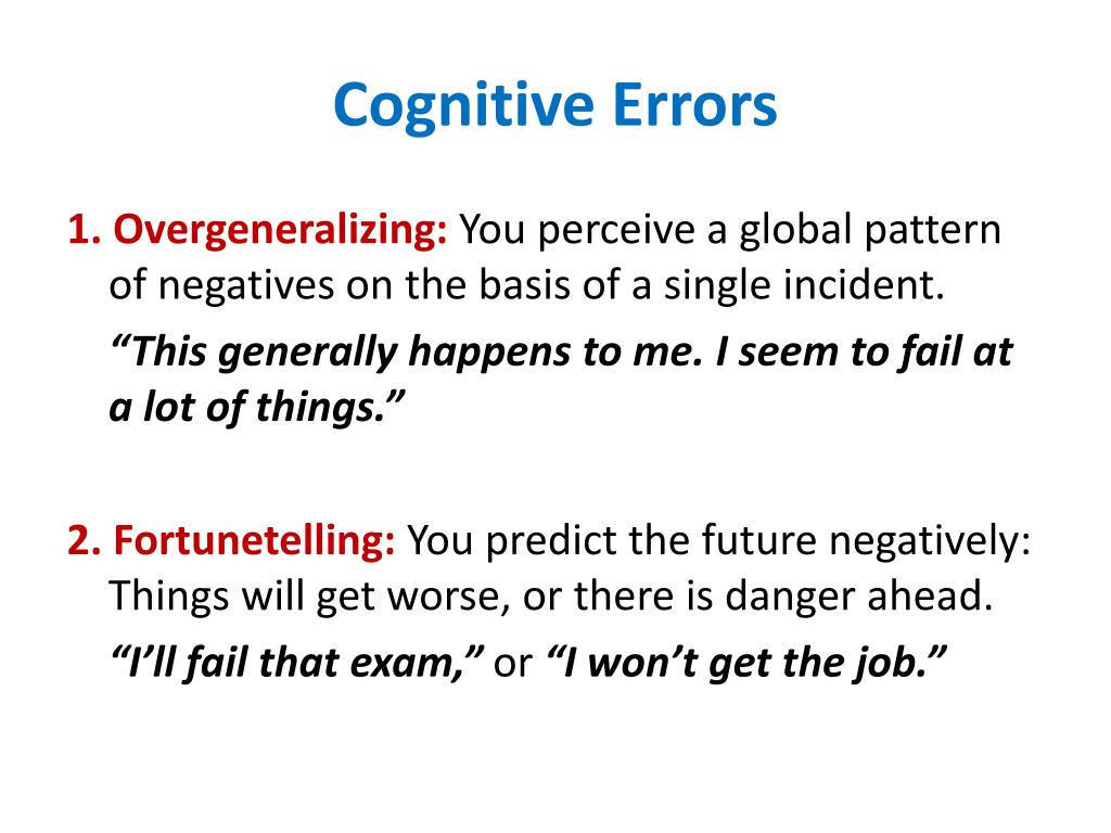 Cognitive Errors 1. Overgeneralizing: You perceive a global pattern of negatives on the basis of a single incident. “This generally happens to me. I seem to fail at a lot of things.” 2. Fortunetelling: You predict the future negatively: Things will get worse, or there is danger ahead. “I’ll fail that exam,” or “I won’t get the job.”
