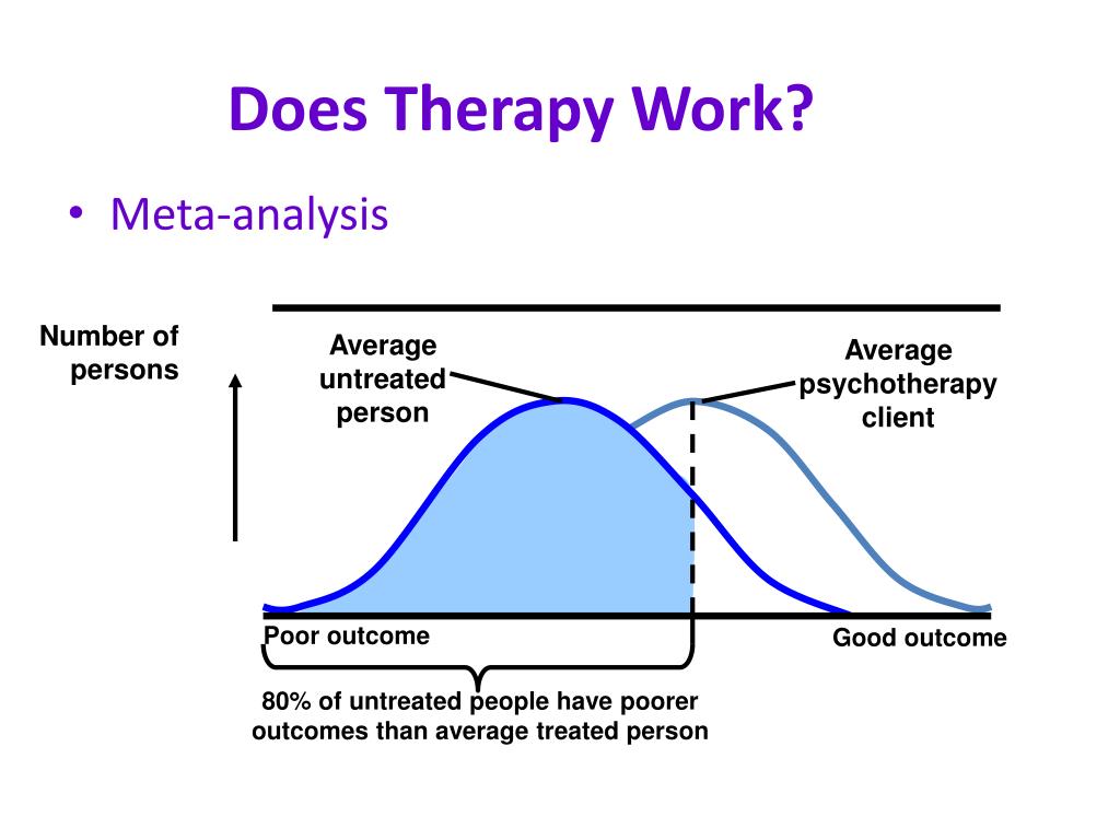 Number of persons Average untreated person Average psychotherapy client Poor outcome Good outcome 80% of untreated people have poorer outcomes than average treated person Does Therapy Work? • Meta-analysis