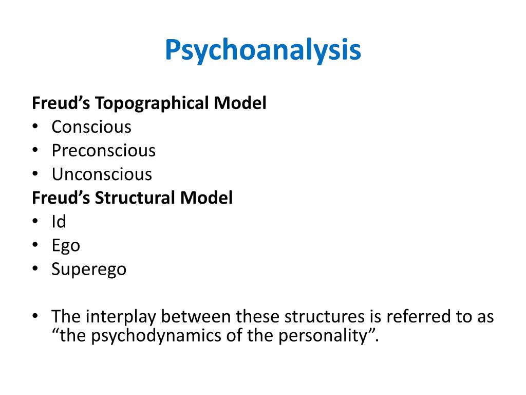 Psychoanalysis Freud’s Topographical Model • Conscious • Preconscious • Unconscious Freud’s Structural Model • Id • Ego • Superego • The interplay between these structures is referred to as “the psychodynamics of the personality”.