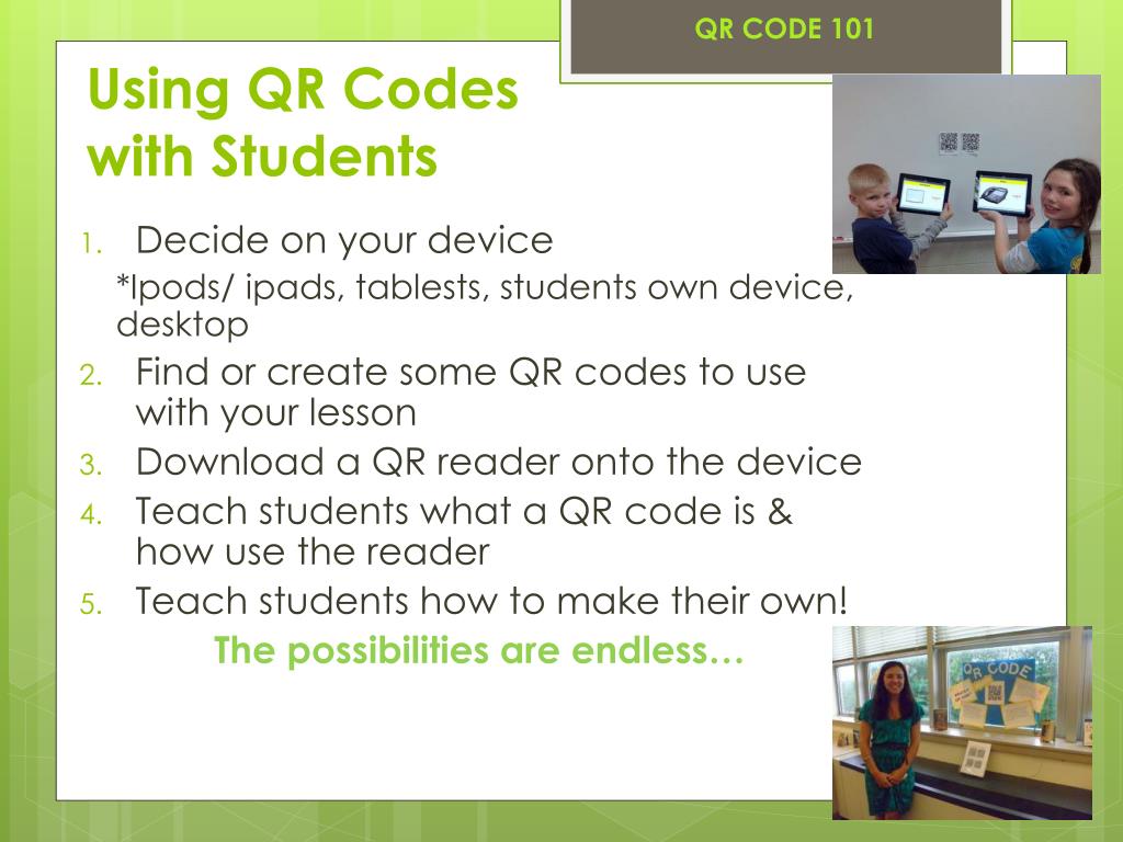 QR CODE 101 Using QR Codes with Students • Decide on your device *Ipods/ipads, tablests, students own device, desktop • Find or create some QR codes to use with your lesson • Download a QR reader onto the device • Teach students what a QR code is & how use the reader • Teach students how to make their own! The possibilities are endless…