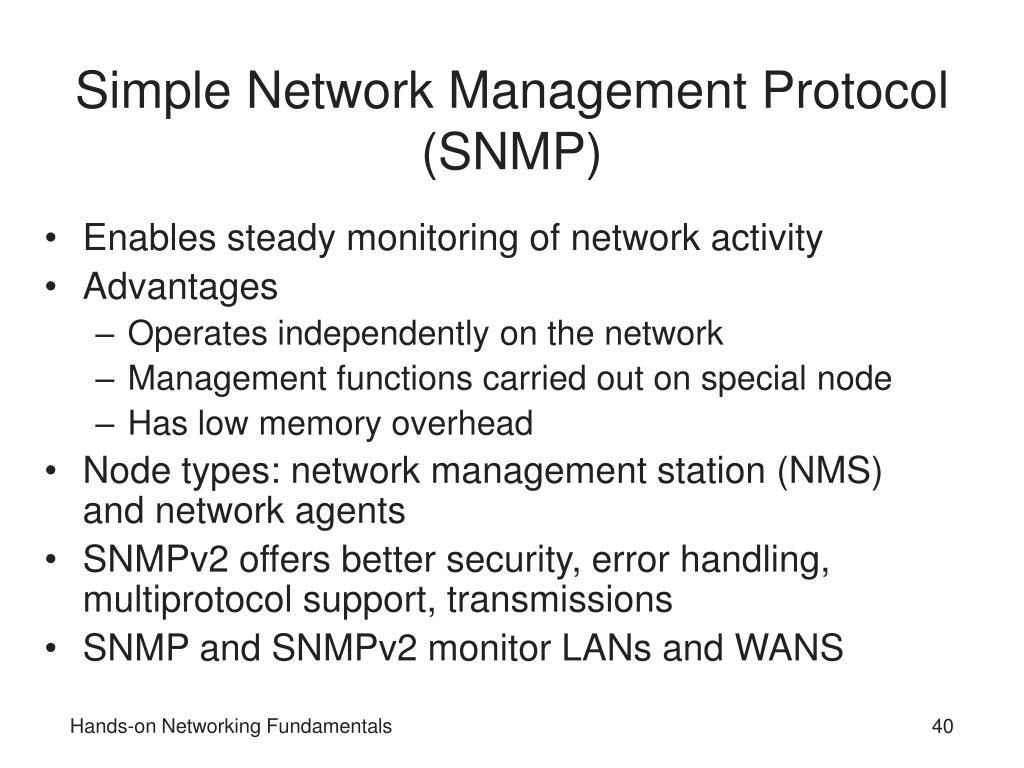 Simple Network Management Protocol (SNMP) • Enables steady monitoring of network activity • Advantages • Operates independently on the network • Management functions carried out on special node • Has low memory overhead • Node types: network management station (NMS) and network agents • SNMPv2 offers better security, error handling, multiprotocol support, transmissions • SNMP and SNMPv2 monitor LANs and WANS Hands-on Networking Fundamentals