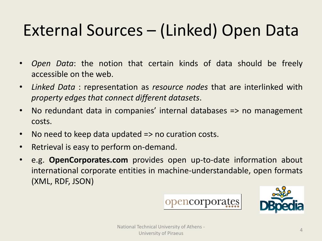 External Sources – (Linked) Open Data • Open Data: the notion that certain kinds of data should be freely accessible on the web. • Linked Data : representation as resource nodes that are interlinked with property edges that connect different datasets. • No redundant data in companies’ internal databases => no management costs. • No need to keep data updated => no curation costs. • Retrieval is easy to perform on-demand. • e.g. OpenCorporates.com provides open up-to-date information about international corporate entities in machine-understandable, open formats (XML, RDF, JSON) National Technical University of Athens - University of Piraeus