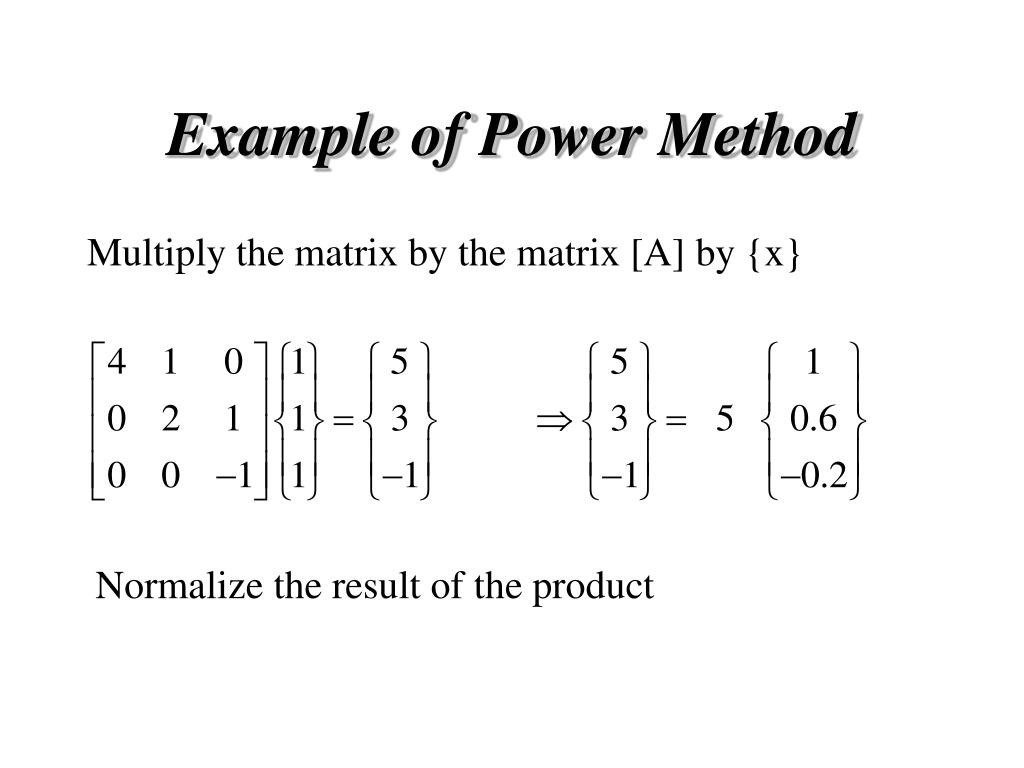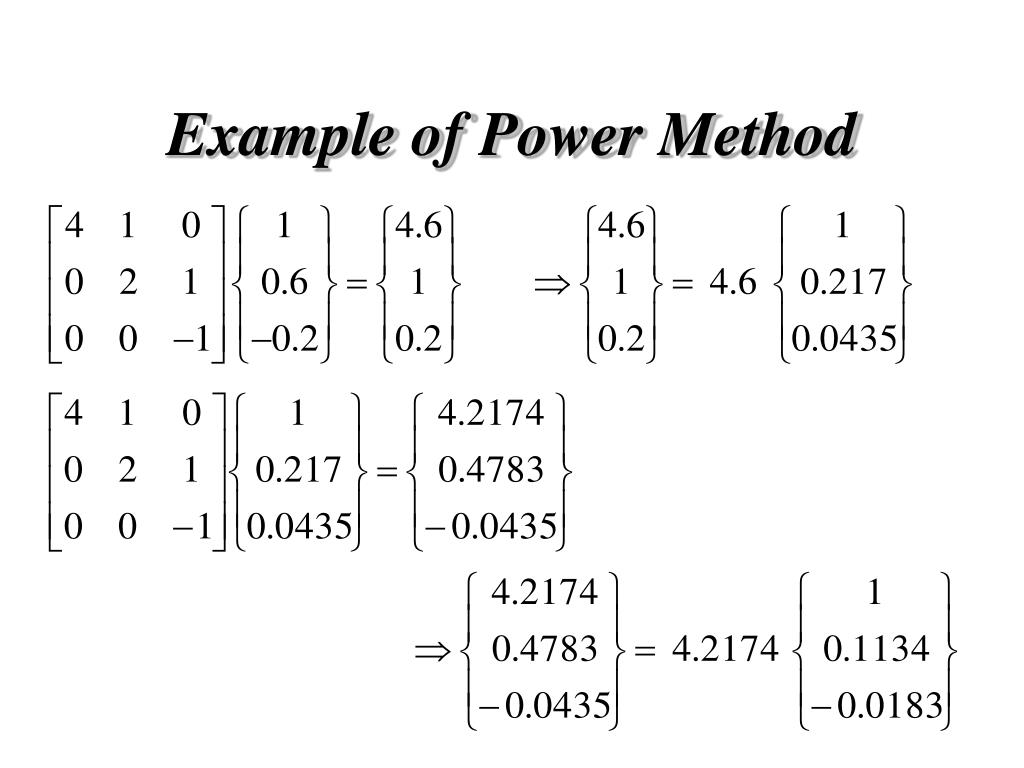 Example of Power Method Multiply the matrix by the matrix [A] by {x} Normalize the result of the product