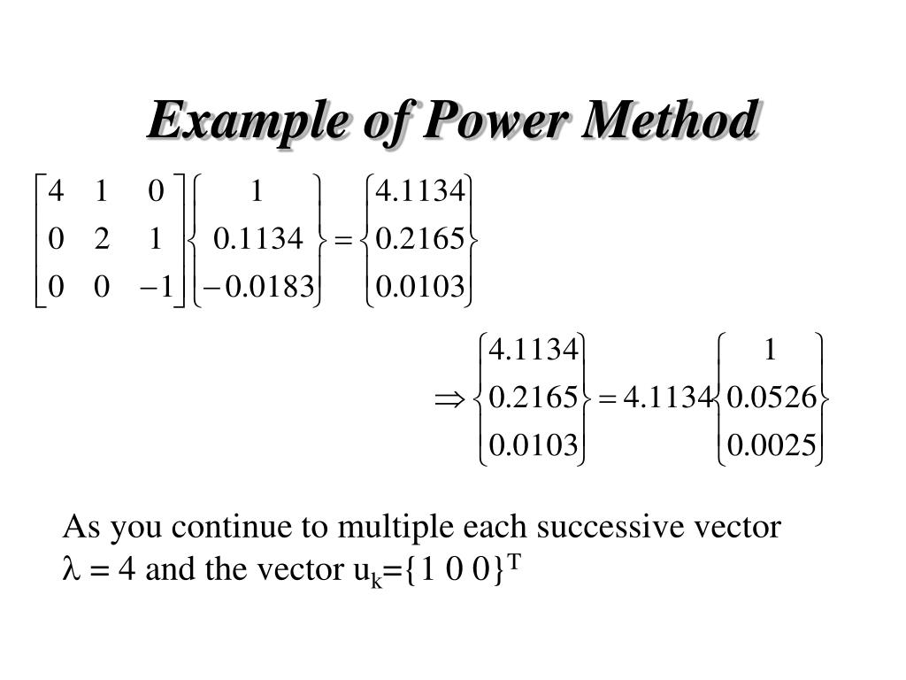 Example of Power Method As you continue to multiple each successive vector l = 4 and the vector uk={1 0 0}T