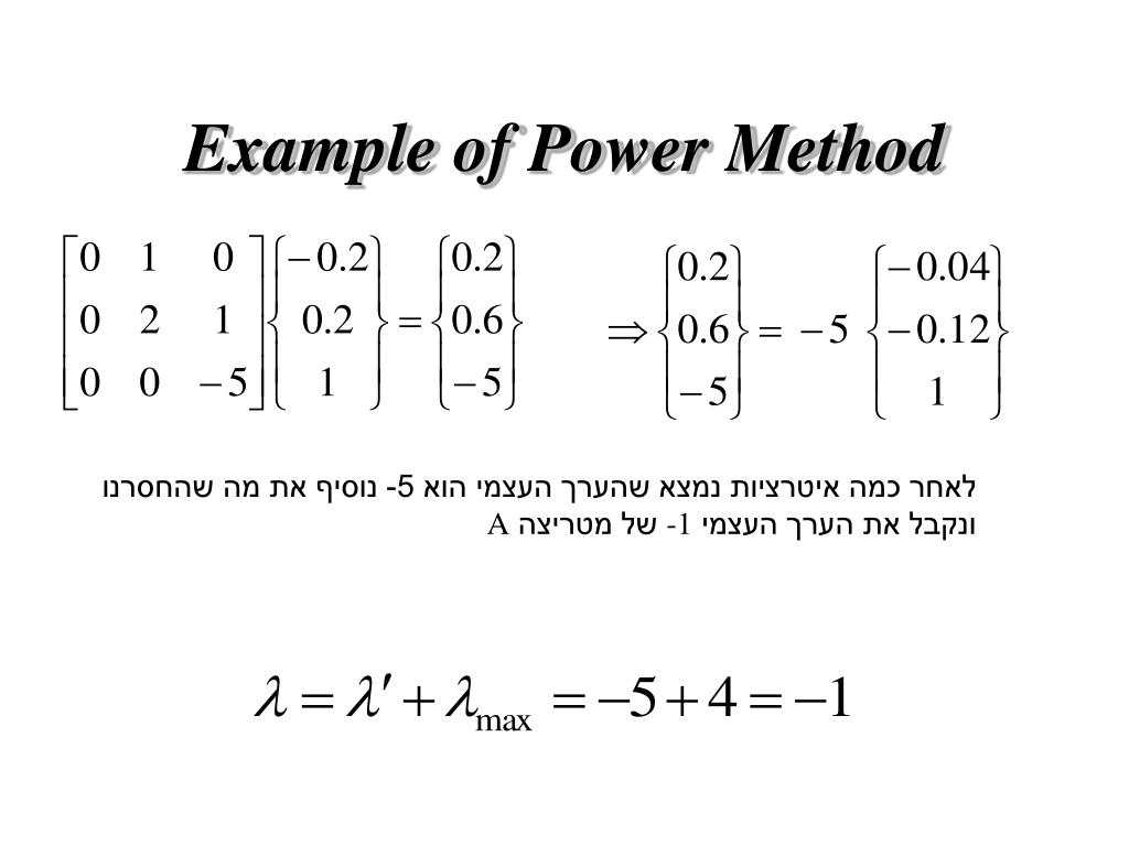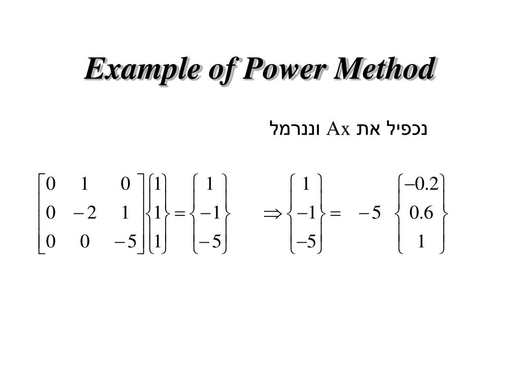 Example of Power Method לאחר כמה איטרציות נמצא שהערך העצמי הוא 5- נוסיף את מה שהחסרנו ונקבל את הערך העצמי -1 של מטריצה A