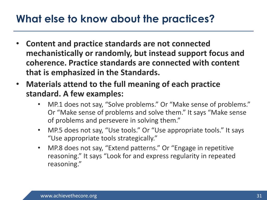 What else to know about the practices? Content and practice standards are not connected mechanistically or randomly, but instead support focus and coherence. Practice standards are connected with content that is emphasized in the Standards. Materials attend to the full meaning of each practice standard. A few examples: • MP.1 does not say, “Solve problems.” Or “Make sense of problems.” Or “Make sense of problems and solve them.” It says “Make sense of problems and persevere in solving them.” • MP.5 does not say, “Use tools.” Or “Use appropriate tools.” It says “Use appropriate tools strategically.” • MP.8 does not say, “Extend patterns.” Or “Engage in repetitive reasoning.” It says “Look for and express regularity in repeated reasoning.”