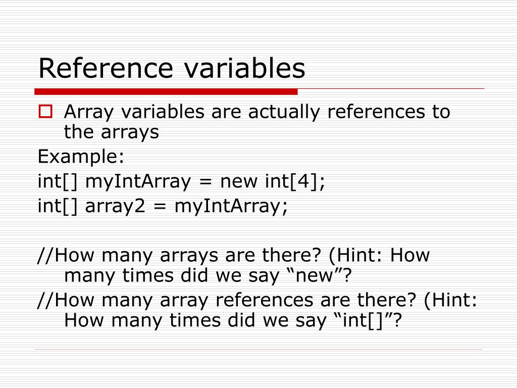 Reference variables • Array variables are actually references to the arrays Example: int[] myIntArray = new int[4]; int[] array2 = myIntArray; //How many arrays are there? (Hint: How many times did we say “new”? //How many array references are there? (Hint: How many times did we say “int[]”?