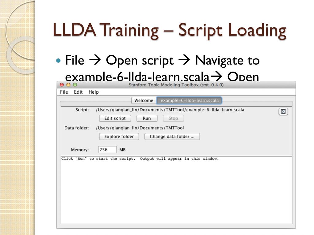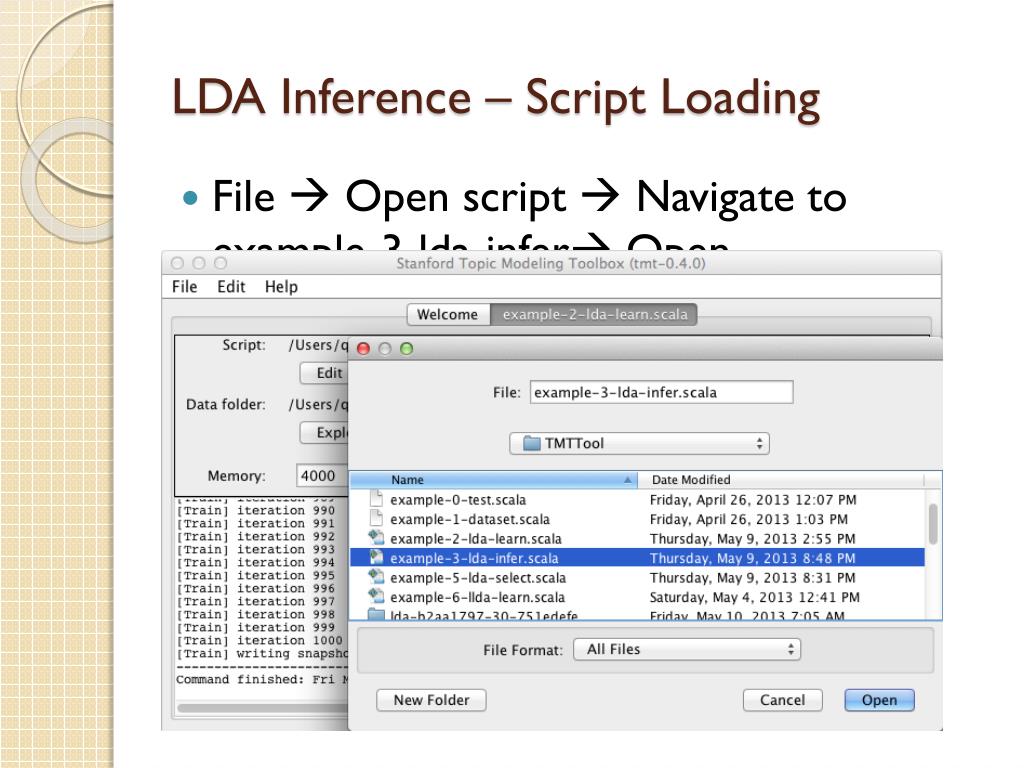 LDA Inference – Script Loading • File Open script Navigate to example-3-lda-infer Open