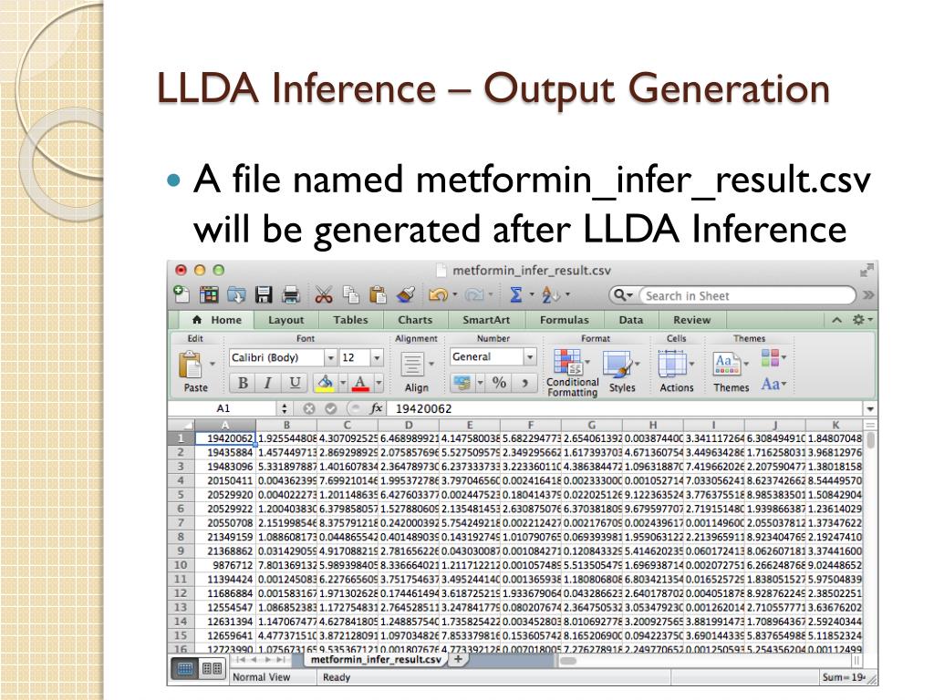 LLDA Inference – Output Generation • A file named metformin_infer_result.csv will be generated after LLDA Inference
