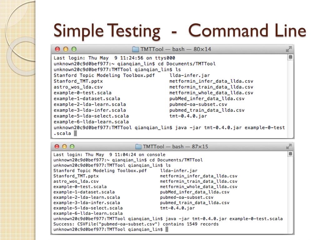 LDA Inference – Command Line • Java –Xmx4G –jar tmt-0.4.0.jar example-3-lda-infer.scala