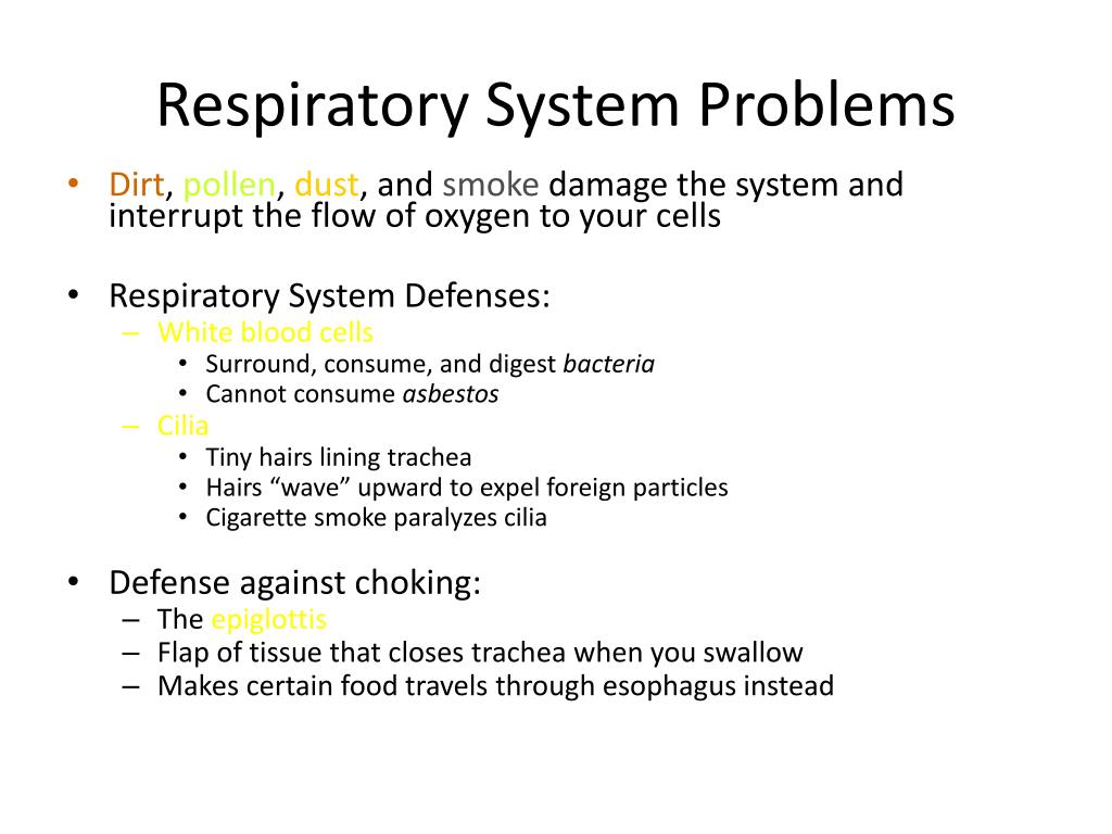 Respiratory System Problems • Dirt, pollen, dust, and smoke damage the system and interrupt the flow of oxygen to your cells • Respiratory System Defenses: • White blood cells • Surround, consume, and digest bacteria • Cannot consume asbestos • Cilia • Tiny hairs lining trachea • Hairs “wave” upward to expel foreign particles • Cigarette smoke paralyzes cilia • Defense against choking: • The epiglottis • Flap of tissue that closes trachea when you swallow • Makes certain food travels through esophagus instead