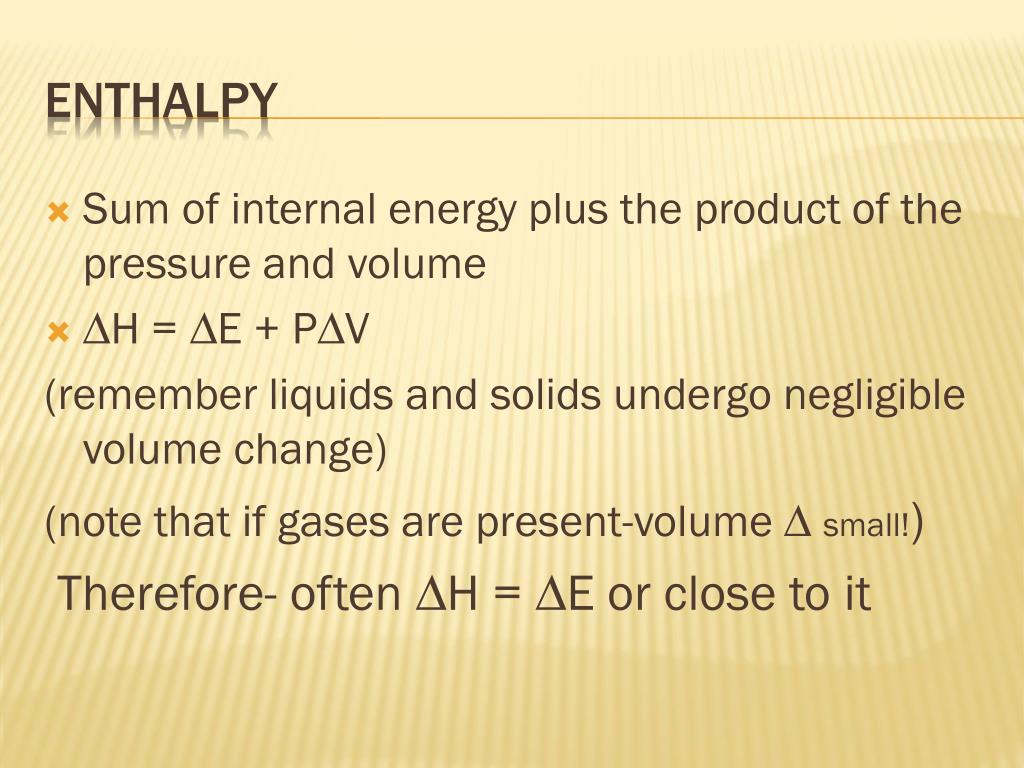 Sum of internal energy plus the product of the pressure and volume ∆H = ∆E + P∆V (remember liquids and solids undergo negligible volume change) (note that if gases are present-volume ∆ small!) Therefore- often ∆H = ∆E or close to it Enthalpy