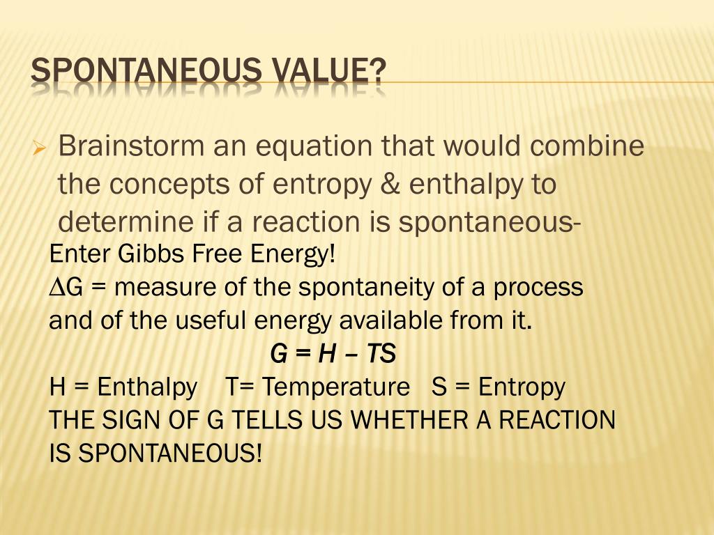 Brainstorm an equation that would combine the concepts of entropy & enthalpy to determine if a reaction is spontaneous- Spontaneous value? Enter Gibbs Free Energy! ∆G = measure of the spontaneity of a process and of the useful energy available from it. G = H – TS H = Enthalpy T= Temperature S = Entropy THE SIGN OF G TELLS US WHETHER A REACTION IS SPONTANEOUS!