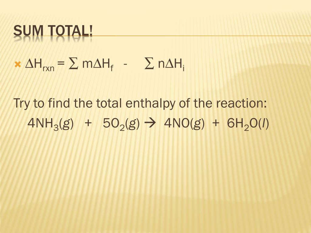 ∆Hrxn= ∑ m∆Hf - ∑ n∆Hi Try to find the total enthalpy of the reaction: 4NH3(g) + 5O2(g) 4NO(g) + 6H2O(l) Sum Total!
