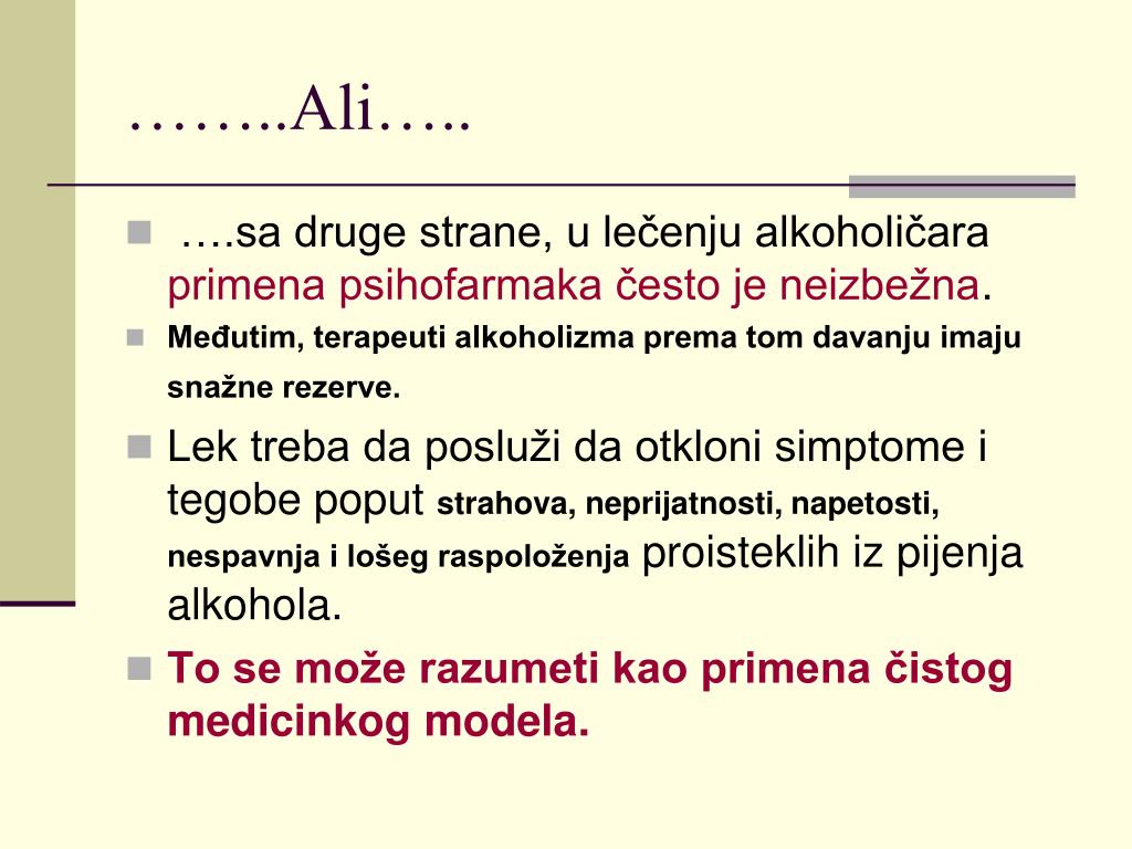 ……..Ali….. • ….sa druge strane, u lečenju alkoholičara primena psihofarmaka često je neizbežna. • Međutim, terapeuti alkoholizma prema tom davanju imaju snažne rezerve. • Lek treba da posluži da otkloni simptome i tegobe poput strahova, neprijatnosti, napetosti, nespavnja i lošeg raspoloženja proisteklih iz pijenja alkohola. • To se može razumeti kao primena čistog medicinkog modela.