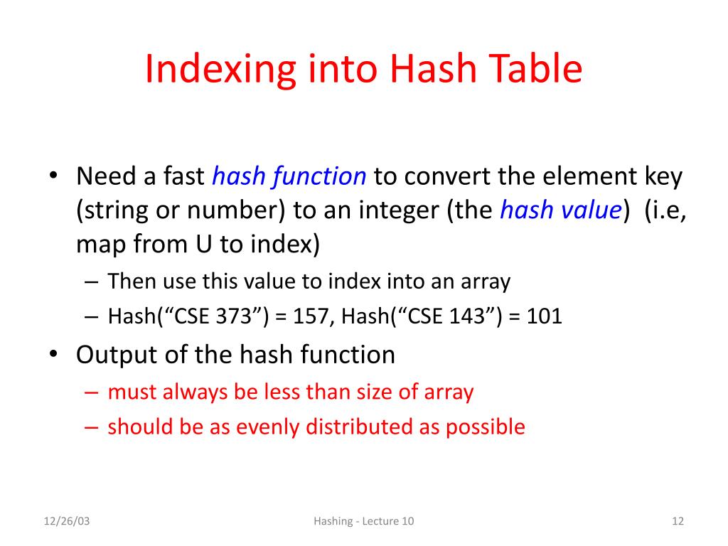 Indexing into Hash Table • Need a fast hash function to convert the element key (string or number) to an integer (the hash value) (i.e, map from U to index) • Then use this value to index into an array • Hash(“CSE 373”) = 157, Hash(“CSE 143”) = 101 • Output of the hash function • must always be less than size of array • should be as evenly distributed as possible Hashing - Lecture 10