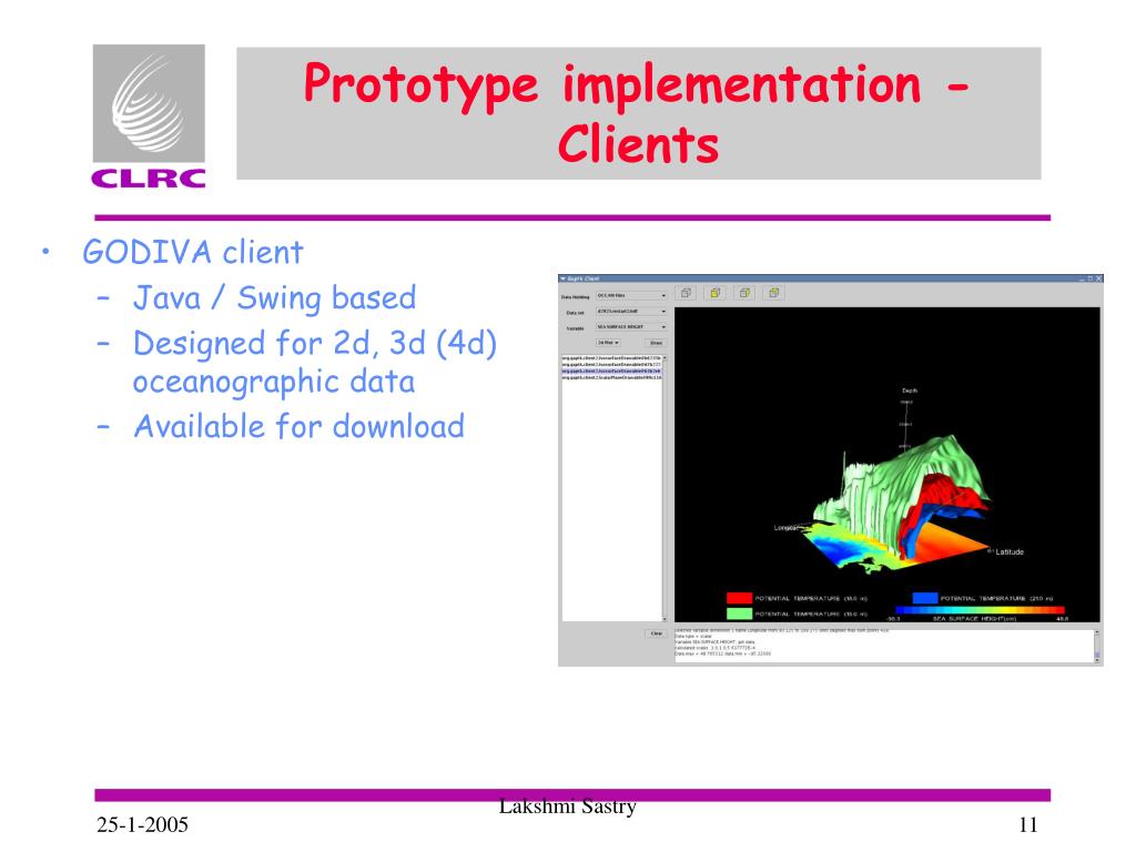 Prototype implementation - Clients • GODIVA client • Java / Swing based • Designed for 2d, 3d (4d) oceanographic data • Available for download Lakshmi Sastry