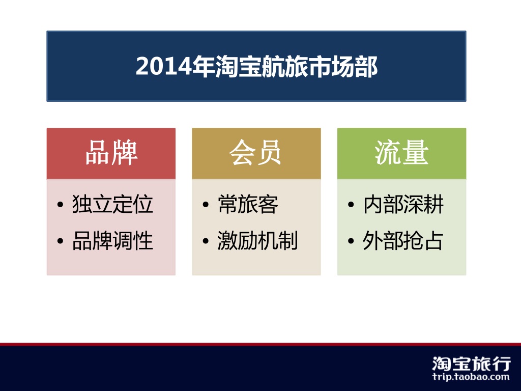 我们的优势 • 阿里系强大的地位和运作能力 • 淘宝旅行多年的积累 • 阿里妈妈深厚的市场基础 • 兄弟单位无限的支持(高德、穷游、快的、CNZZ…………) • 团队 • 当然,还有你们!