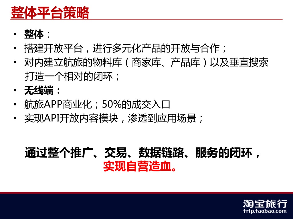 整体平台策略 • 整体: • 搭建开放平台,进行多元化产品的开放与合作; • 对内建立航旅的物料库(商家库、产品库)以及垂直搜索 • 打造一个相对的闭环; • 无线端: • 航旅APP商业化;50%的成交入口 • 实现API开放内容模块,渗透到应用场景; 通过整个推广、交易、数据链路、服务的闭环, 实现自营造血。