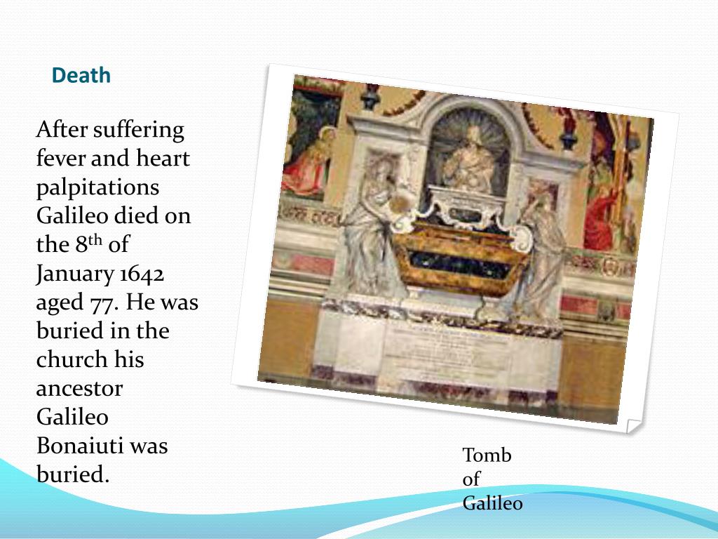 Death After suffering fever and heart palpitations Galileo died on the 8th of January 1642 aged 77. He was buried in the church his ancestor Galileo Bonaiuti was buried. Tomb of Galileo