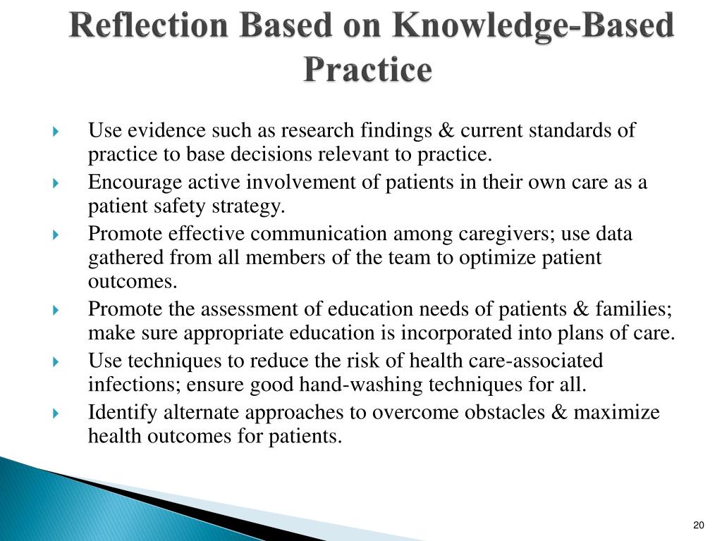 Reflection Based on Knowledge-Based Practice • Use evidence such as research findings & current standards of practice to base decisions relevant to practice. • Encourage active involvement of patients in their own care as a patient safety strategy. • Promote effective communication among caregivers; use data gathered from all members of the team to optimize patient outcomes. • Promote the assessment of education needs of patients & families; make sure appropriate education is incorporated into plans of care. • Use techniques to reduce the risk of health care-associated infections; ensure good hand-washing techniques for all. • Identify alternate approaches to overcome obstacles & maximize health outcomes for patients.
