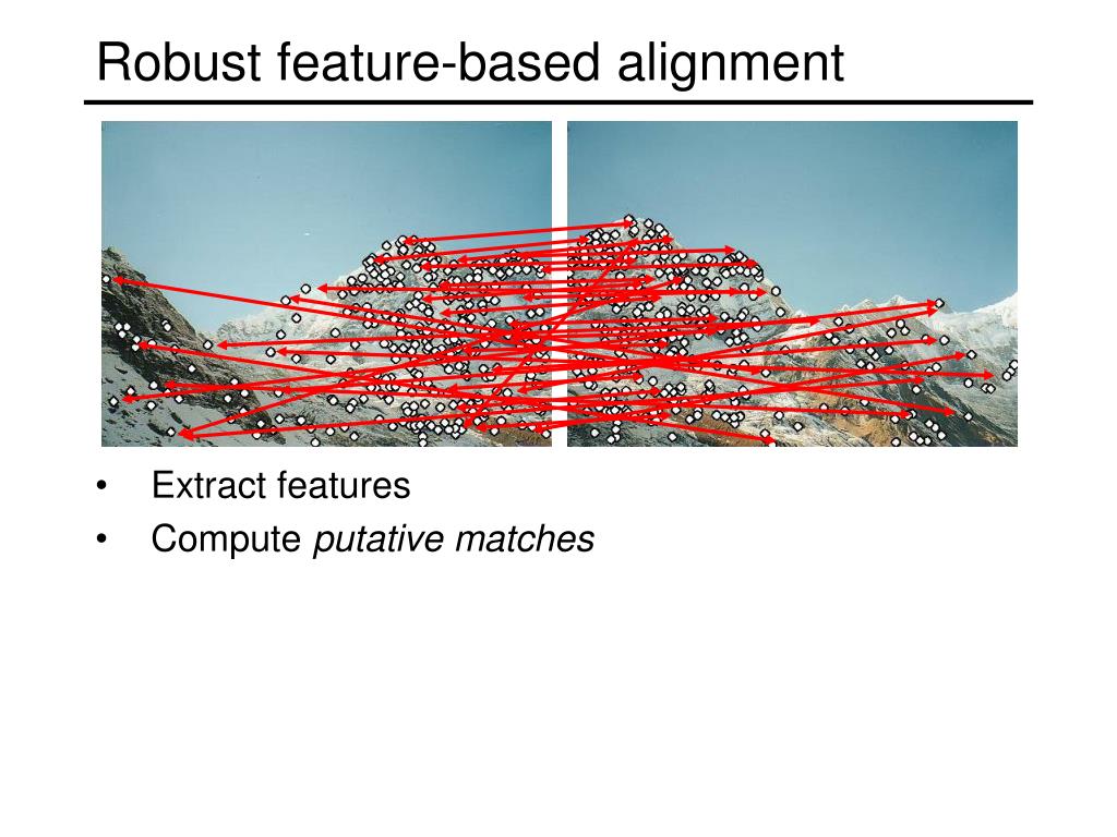 Robust feature-based alignment • Extract features • Compute putative matches • Loop: • Hypothesize transformation T