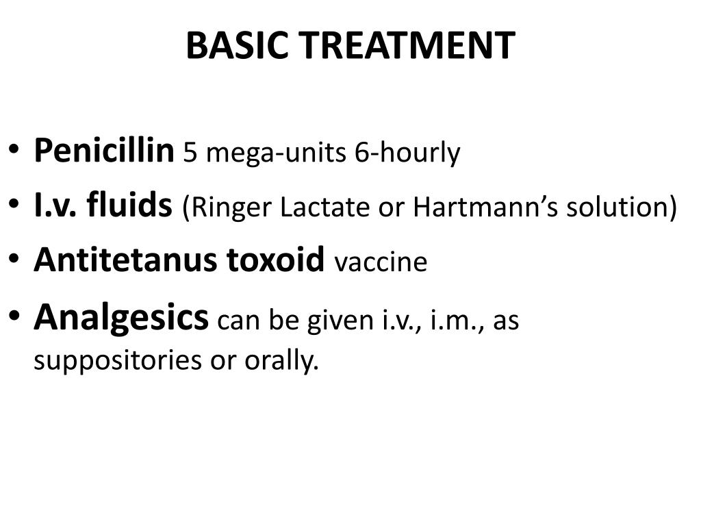 BASIC TREATMENT • Penicillin 5 mega-units 6-hourly • I.v. fluids (Ringer Lactate or Hartmann’s solution) • Antitetanustoxoidvaccine • Analgesics can be given i.v., i.m., as suppositories or orally.