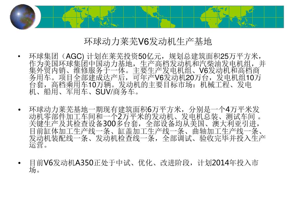 环球动力莱芜V6发动机生产基地 环球集团(AGC) 计划在莱芜投资50亿元,规划总建筑面积25万平方米,作为美国环球集团中国动力基地,生产高档发动机和汽柴油发电机组,并集外贸内销、维修服务于一体。主要生产发电机组、V6发动机和高档商务用车。项目全部建成达产后,可年产V6发动机20万台,发电机组10万台套,高档乘用车10万辆。发动机的主要目标市场:机械工程、发电机、船用、军用车、SUV/商务车。 环球动力莱芜基地一期现有建筑面积6万平方米,分别是一个4万平米发动机零部件加工车间和一个2万平米的发动机、发电机总装、测试车间 。关键生产及其检查设备300多台套,全部设备均从美国、澳大利亚引进,目前缸体加工生产线一条、缸盖加工生产线一条、曲轴加工生产线一条、发动机装配线一条、发动机检查线一条,全部调试、验收完毕并投入生产运营。 目前V6发动机A350正处于中试、优化、改进阶段,计划2014年投入市场。