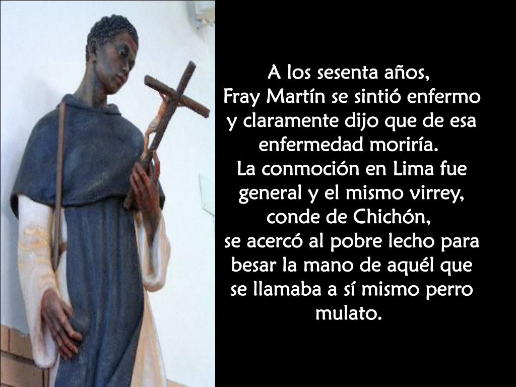 A los sesenta años, Fray Martín se sintió enfermo y claramente dijo que de esa enfermedad moriría. La conmoción en Lima fue general y el mismo virrey, conde de Chichón, se acercó al pobre lecho para besar la mano de aquél que se llamaba a sí mismo perro mulato.