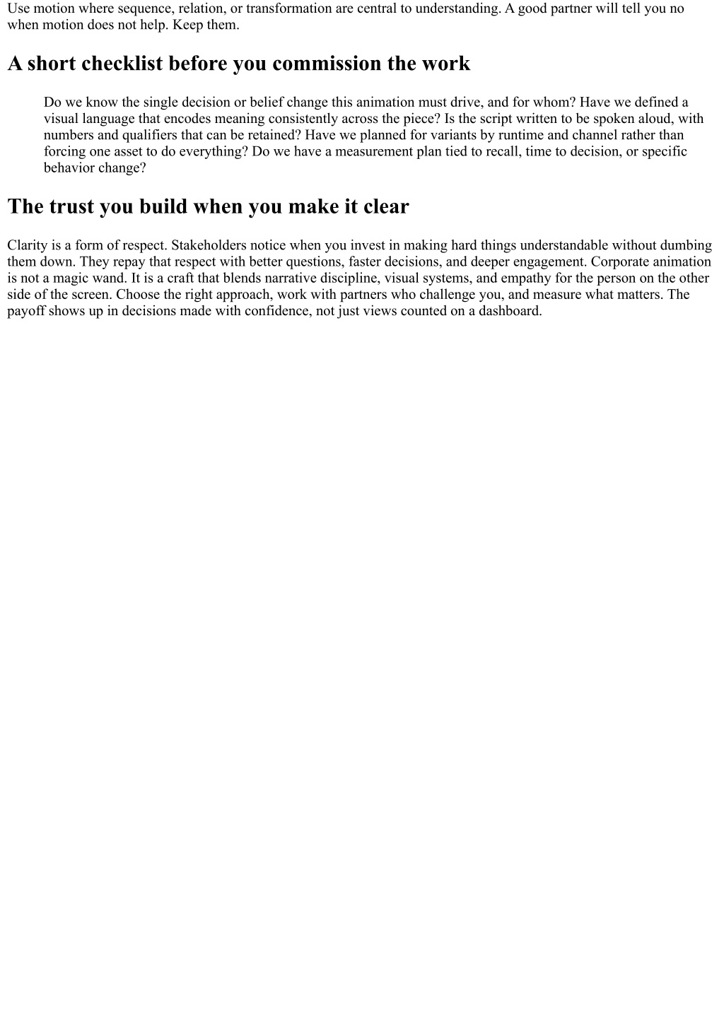 Use motion where sequence, relation, or transformation are central to understanding. A good partner will tell you no when motion does not help. Keep them. A short checklist before you commission the work Do we know the single decision or belief change this animation must drive, and for whom? Have we defined a visual language that encodes meaning consistently across the piece? Is the script written to be spoken aloud, with numbers and qualifiers that can be retained? Have we planned for variants by runtime and channel rather than forcing one asset to do everything? Do we have a measurement plan tied to recall, time to decision, or specific behavior change? The trust you build when you make it clear Clarity is a form of respect. Stakeholders notice when you invest in making hard things understandable without dumbing them down. They repay that respect with better questions, faster decisions, and deeper engagement. Corporate animation is not a magic wand. It is a craft that blends narrative discipline, visual systems, and empathy for the person on the other side of the screen. Choose the right approach, work with partners who challenge you, and measure what matters. The payoff shows up in decisions made with confidence, not just views counted on a dashboard.