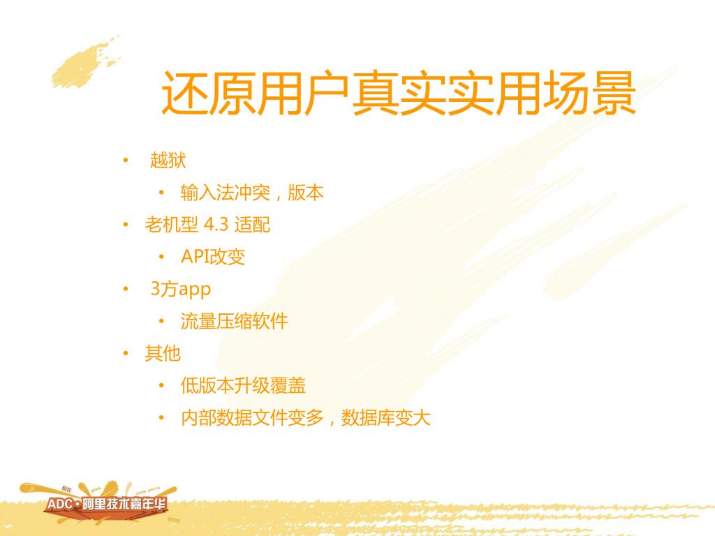 还原用户真实实用场景 • 越狱 • 输入法冲突,版本 • 老机型 4.3 适配 • API改变 • 3方app • 流量压缩软件 • 其他 • 低版本升级覆盖 • 内部数据文件变多,数据库变大