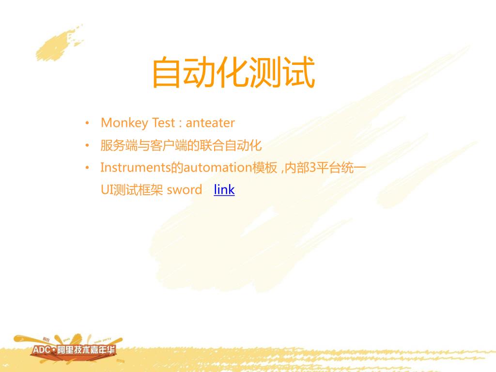 自动化测试 • MonkeyTest: anteater • 服务端与客户端的联合自动化 • Instruments的automation模板 ,内部3平台统一UI测试框架 swordlink
