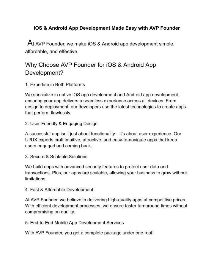 ● iOS App Development ● Android App Development ● Cross-Platform Development ● App UI/UX Design ● App Store Optimization (ASO) ● Maintenance & Support 6. SEO & App Store Optimization (ASO) We don’t just build apps—we help them succeed. Our ASO strategies improve your app’s visibility on the Apple App Store and Google Play Store, driving more downloads and user engagement. Why AVP Founder is the Best Choice for App Development ● Skilled iOS & Android Developers ● Customized Business Solutions ● Secure, High-Performance Apps ● Affordable & Transparent Pricing ● Ongoing Support & Maintenance If you’re looking for a trusted partner to build your next mobile app, AVP Founder makes iOS & Android app development easy and effective.